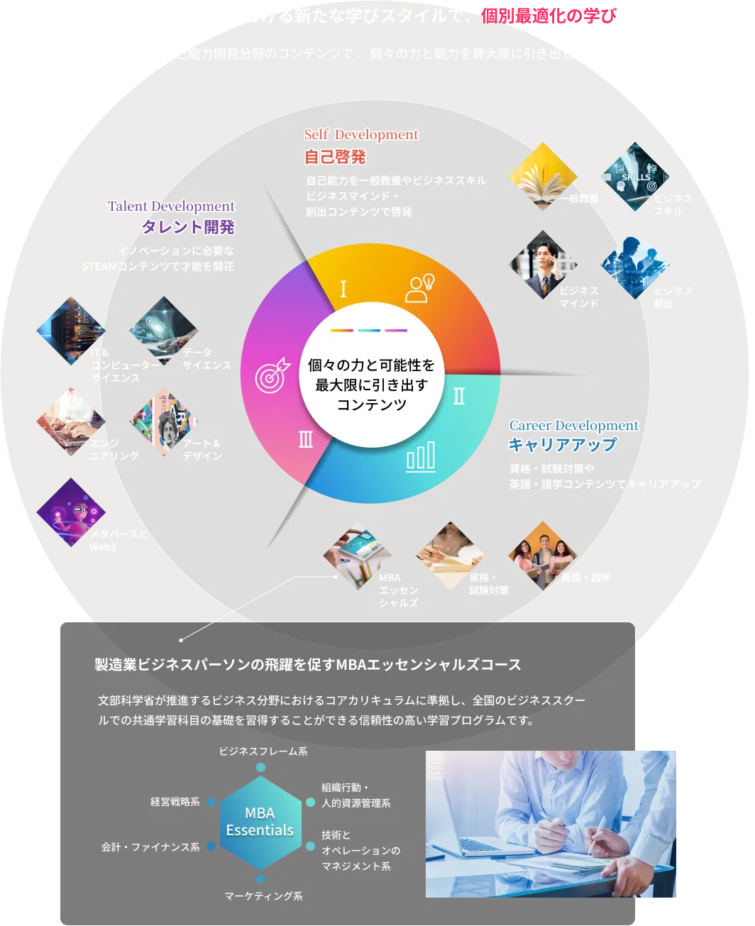 「e-JINZAI for maker」では、5本柱のWEB 研修を通じて
