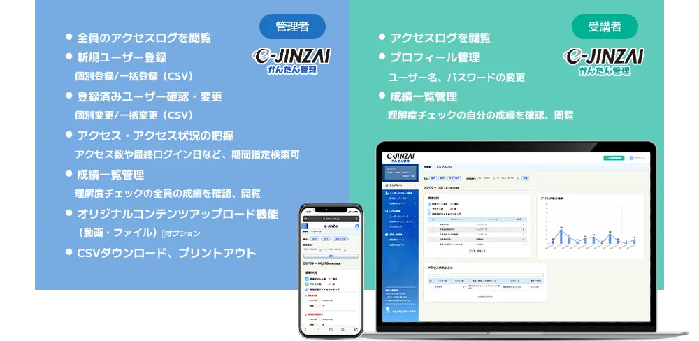 - オリジナル資料のアップロードや視聴履歴、テスト結果などが一元化できる管理システム「e-JINZAI LMS」をご用意。