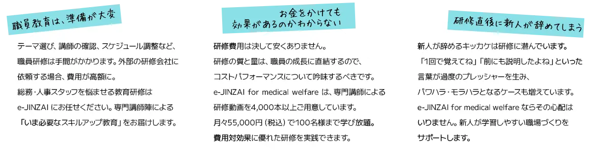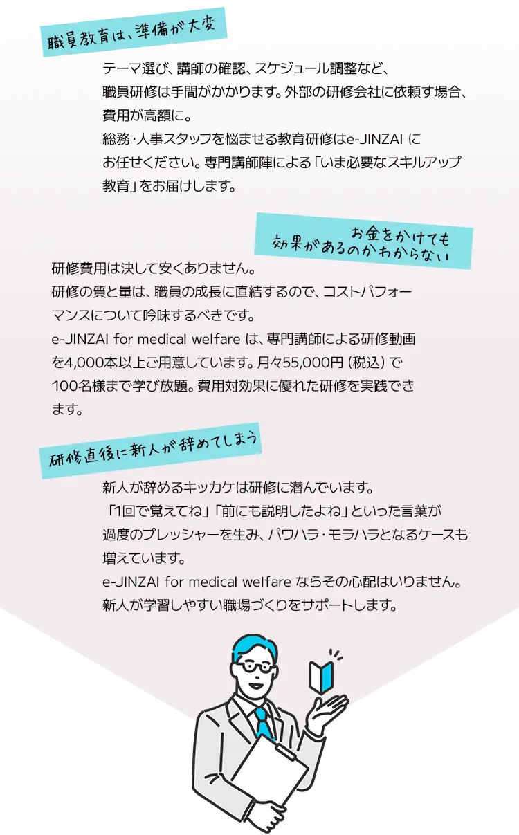 そのような中、対利用者・ご家族への接遇マナーの向上を図るために、法人内研修を検討していましたが、外部講師による研修は高額で、集合参加型の研修はタイミングが合わず、タイムリーな研修実施ができませんでした。そこで、eラーニングの導入を検討しました。 e-JINZAI を活用すると低コストでいつでも職員研修の機会を作ることができ、育成の悩みを解決することができました。