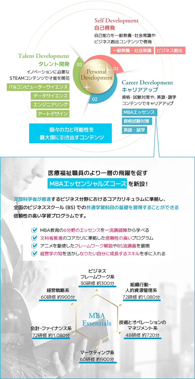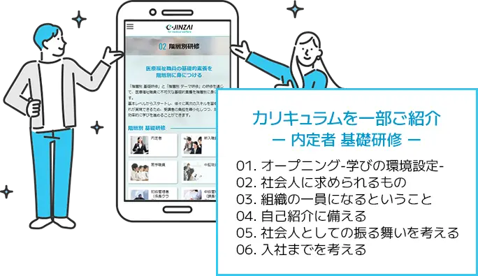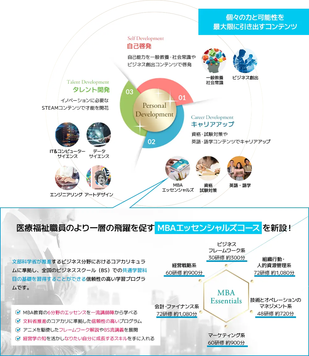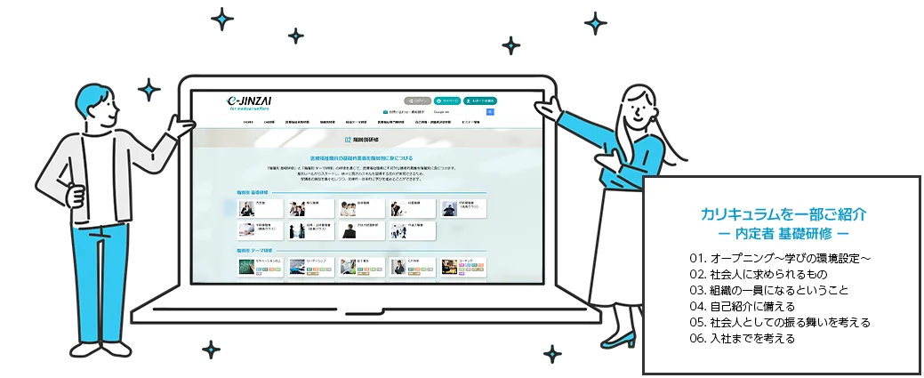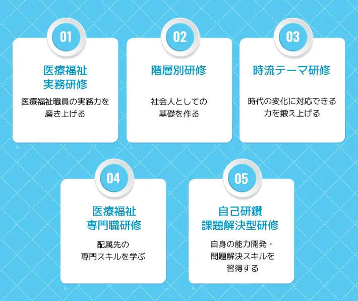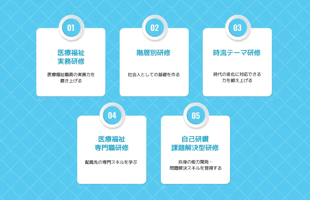 「e-JINZAI for medical welfare」では、5本柱のWEB 研修を通じて