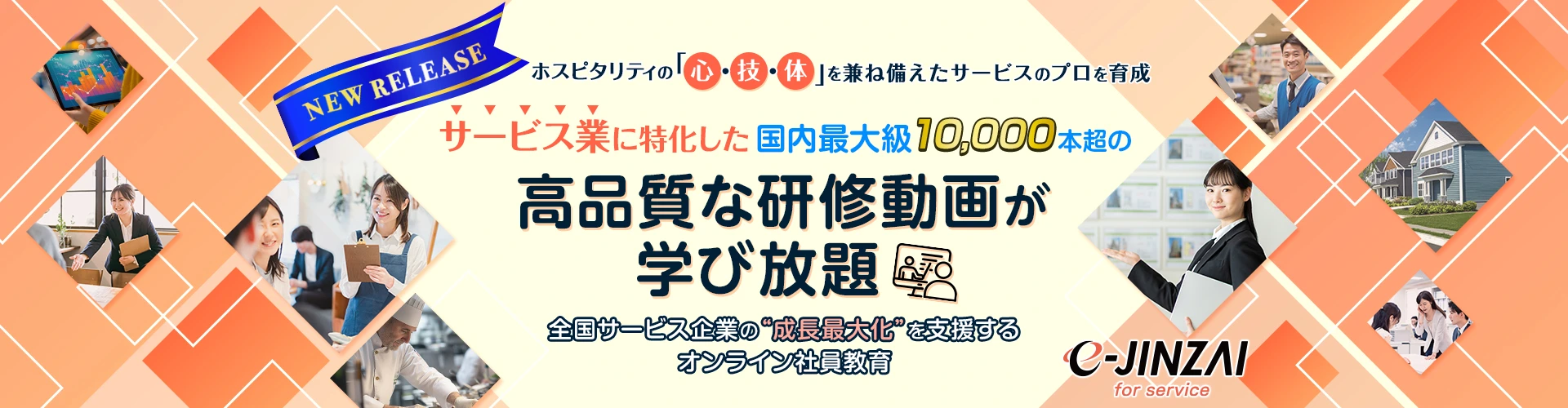 e-JINZAI for serviceは専門講師による研修動画を10,000本以上ご用意しています。サービス業向けに特化した多種多彩なコンテンツでじっくり学ぶことができます。 -